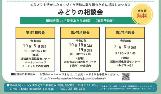 花やみどりのまちづくり活動に関して、個別に相談を受けます。個人の活動だけでなく、行政や企業との協働に関する相談も対応しますので、お気軽に参加してください。事前申込で1人(団体)1時間程度です。